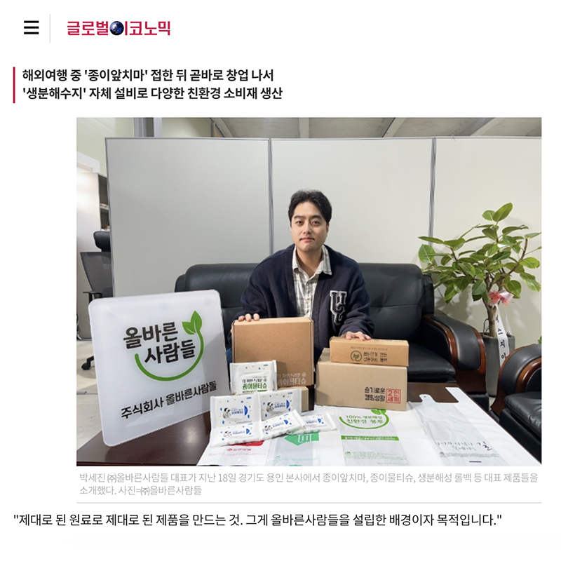 [뉴스人] 박세진 ㈜올바른사람들 대표 "원료부터 제품까지 '올바름'이 원칙"